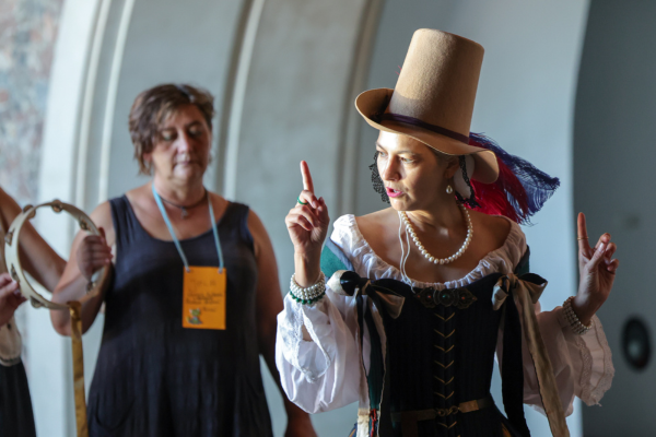 Na warsztacie z tańców dawnych uczestnicy i uczestniczki poznawali kroki i układy inspirowane historycznymi tradycjami tanecznymi. Praca w parach i grupach pozwalała rozluźnić atmosferę i lepiej się zintegrować. Taniec i towarzysząca mu muzyka pozwalały poczuć ducha dawnych epok.